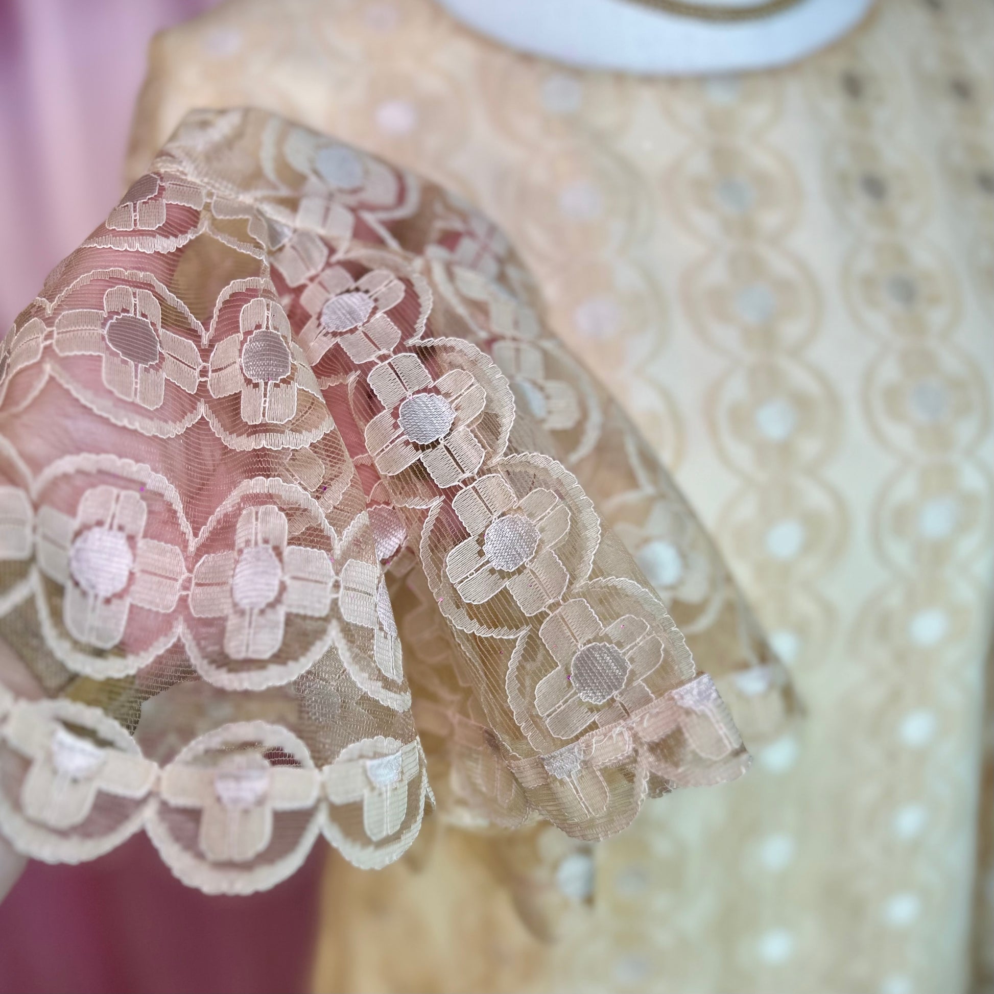 Absolutely adorable lacey top from the 60s! In a delicate pale peachy shade with little iridescent buttons down the back and the most incredible circular flared sleeves! The bodice is lined while the sleeves are left sheer and stunning!