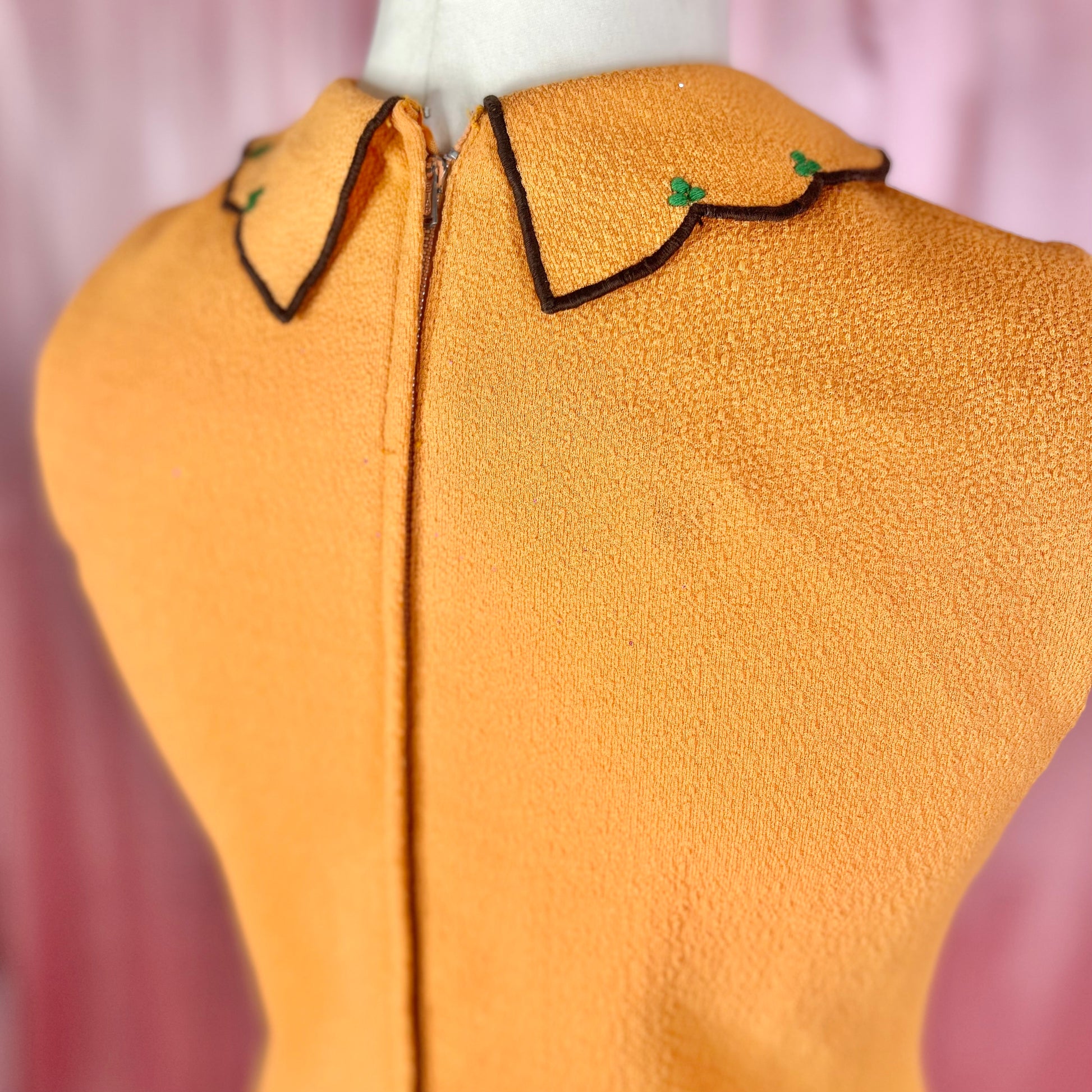 A cutie patootie of a pumpkin orange 60s mini! Made out of Crimplene that has a slight stretch to it and with the prettiest little scalloped embroidered collar. This would look so cute in the summer, or add a cardigan and layer over some opaque tights for the colder months!