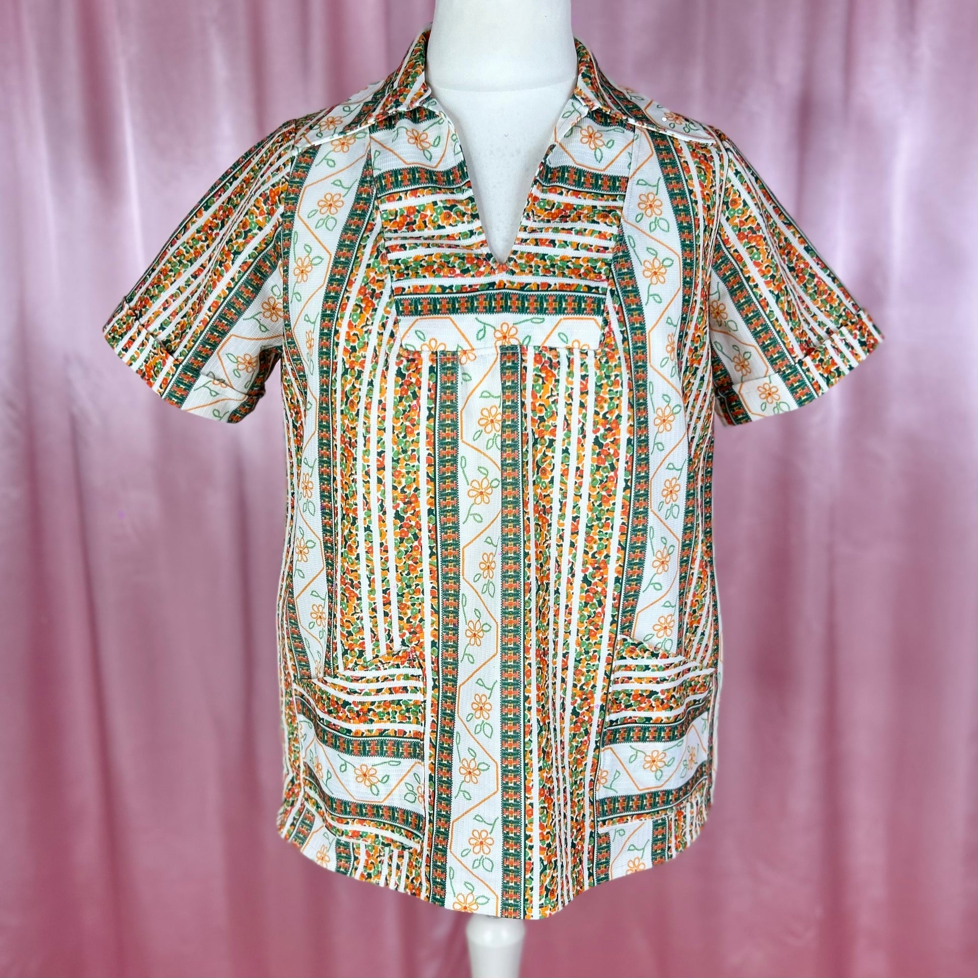 Lovely early 70s smock top in a loose relaxed fit, covered in an orange and green floral striped pattern. This has an open collar design, short sleeves and the all import pockets!