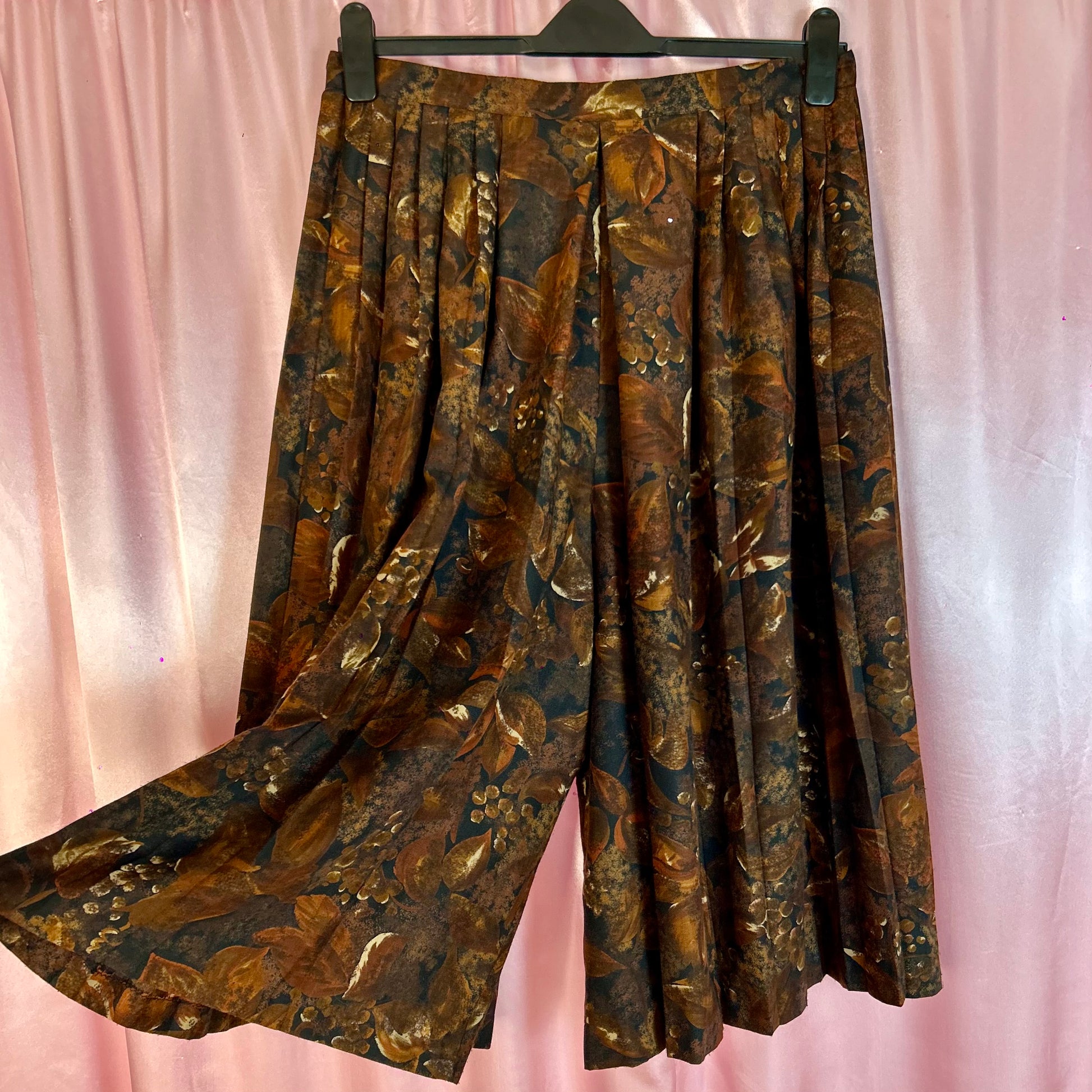 These wide leg culottes are the perfect option for when you cant decide between a skirt or trousers! They have so much material pleated into the waistband so are lovely and flared, covered in a brown floral pattern on a black background. Fastening in the back with a zip and button.