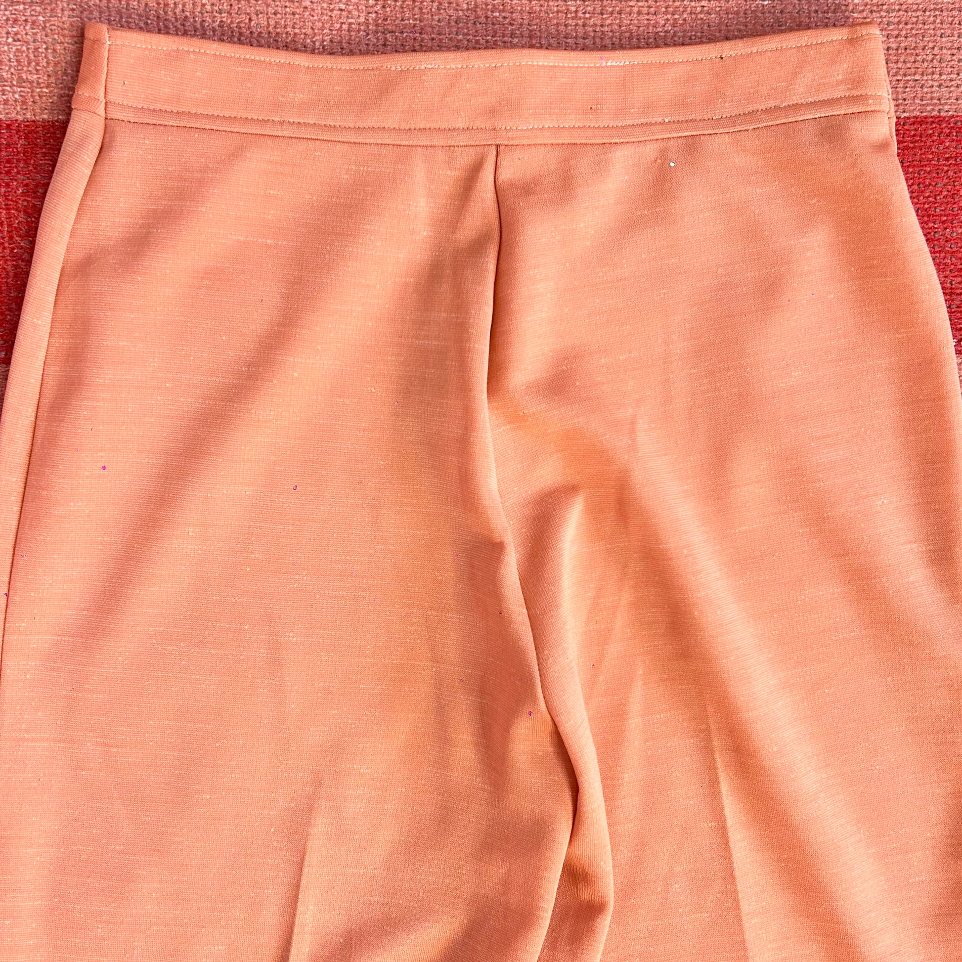 Fab pair of 70s high waisted flares in a peachy coral type colour! They have a yolked waistband with topstitching details and fasten at the front with two small buttons and zip. The Crimplene material also has a slight stretch to it.