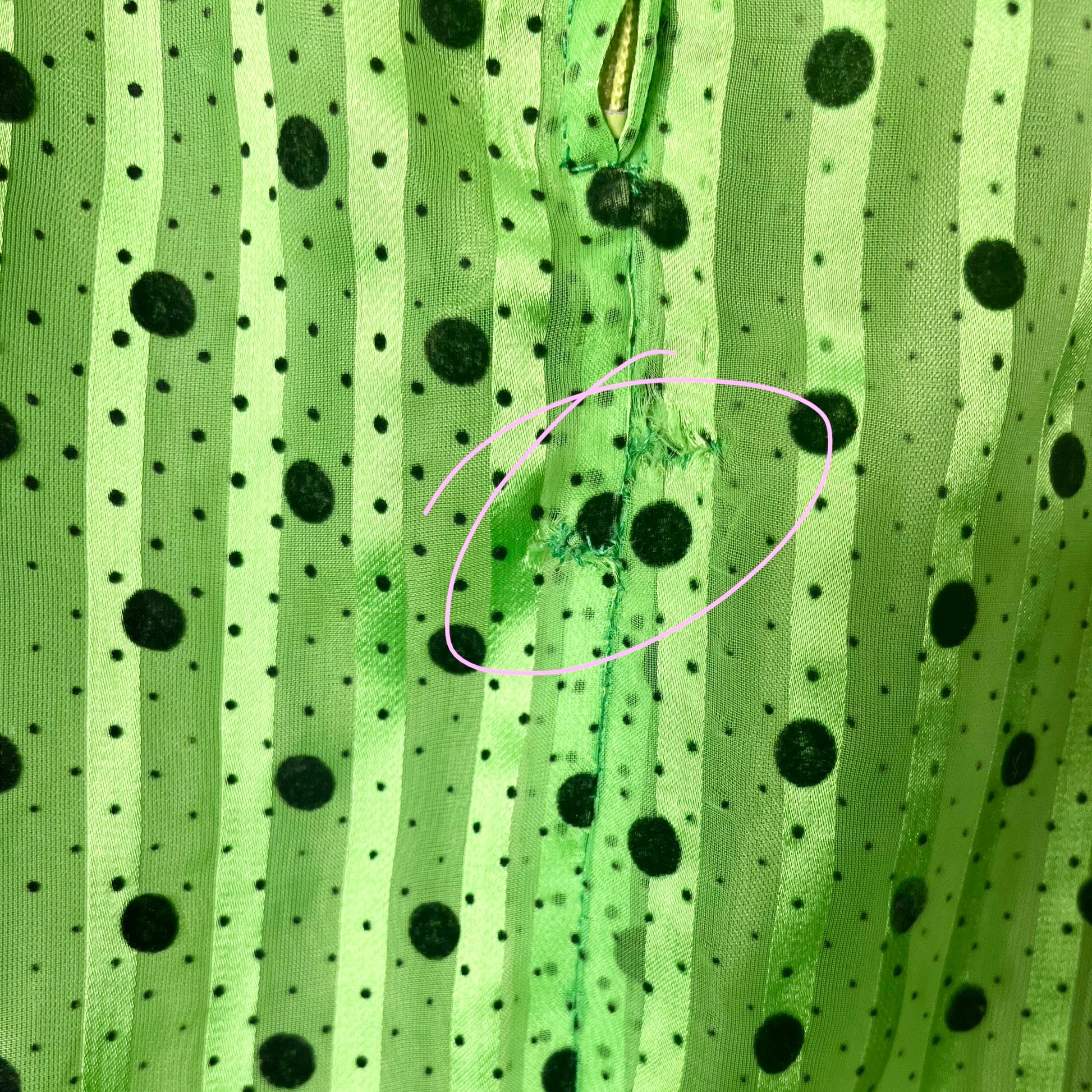Is this too much? Do we care?! Absolutely not! Bright green fully lined maxi dress covered in little black flocked velvet polka dots! Short flared sleeves and a plunging neckline, finished with a little velvet corsage in the centre. Zips up the back.