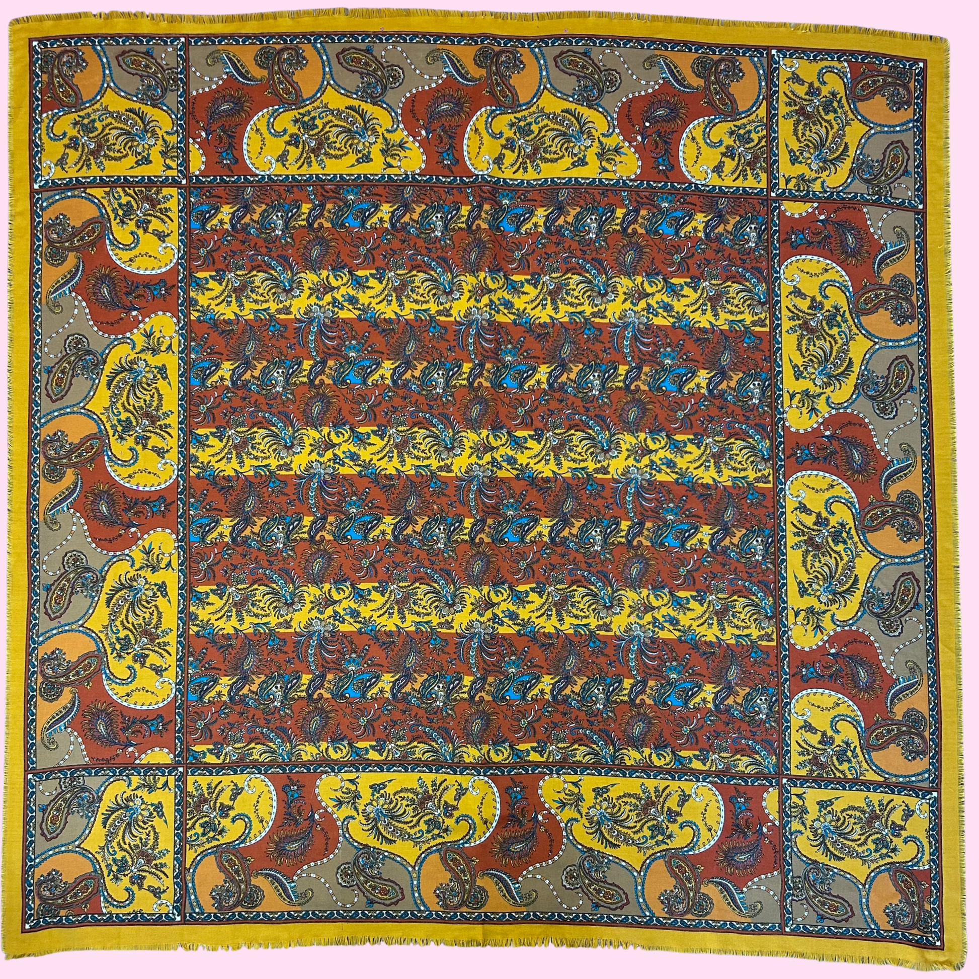 Large square scarf covered in a paisley pattern in warn gold and brown tones!