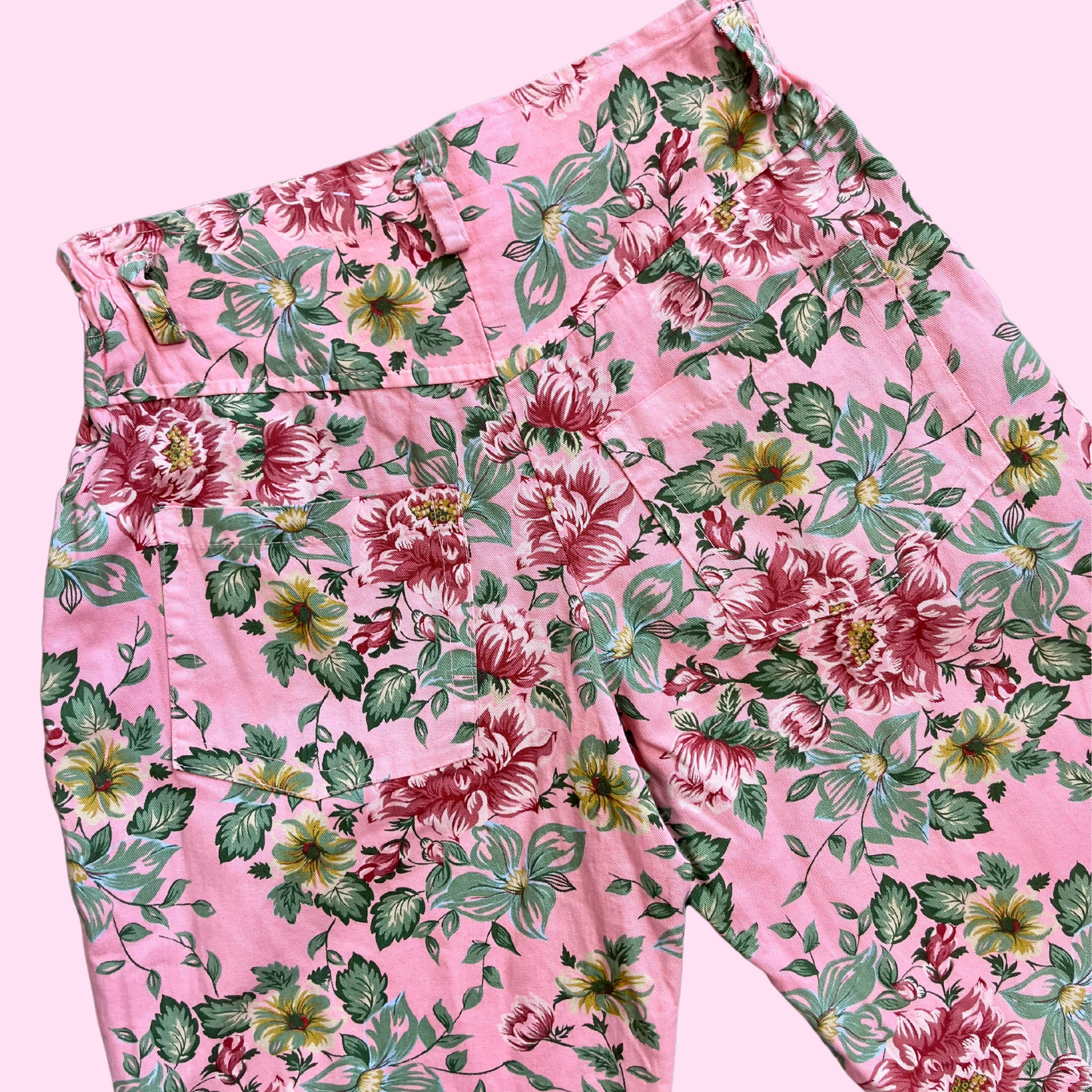 There have such fun summer vibes! Pink toned cotton mom jeans adorned with a beautiful rose and leaf pattern! They have the all important pockets at the front and back, and belt loops so you can cinch that waist and accessories with a cute belt! Classic fly zip fastening with two metal buttons.