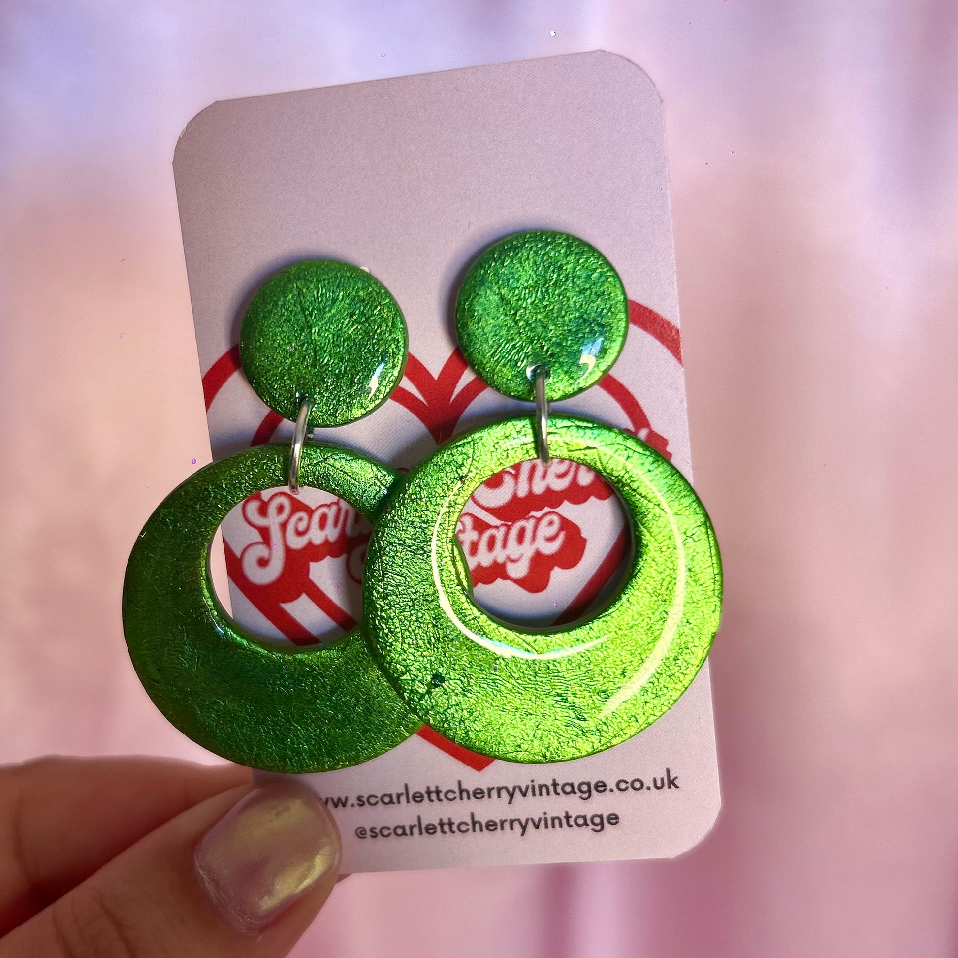 Green metallic door knocker style earrings. Made out of polymer clay and finished in a clear shiny resin.